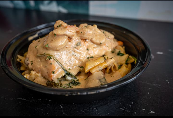 Disfruta de nuestro bol repleto de proteínas con salmón y gambas a la parrilla, servido sobre una cama de col salteada o pasta cajún.