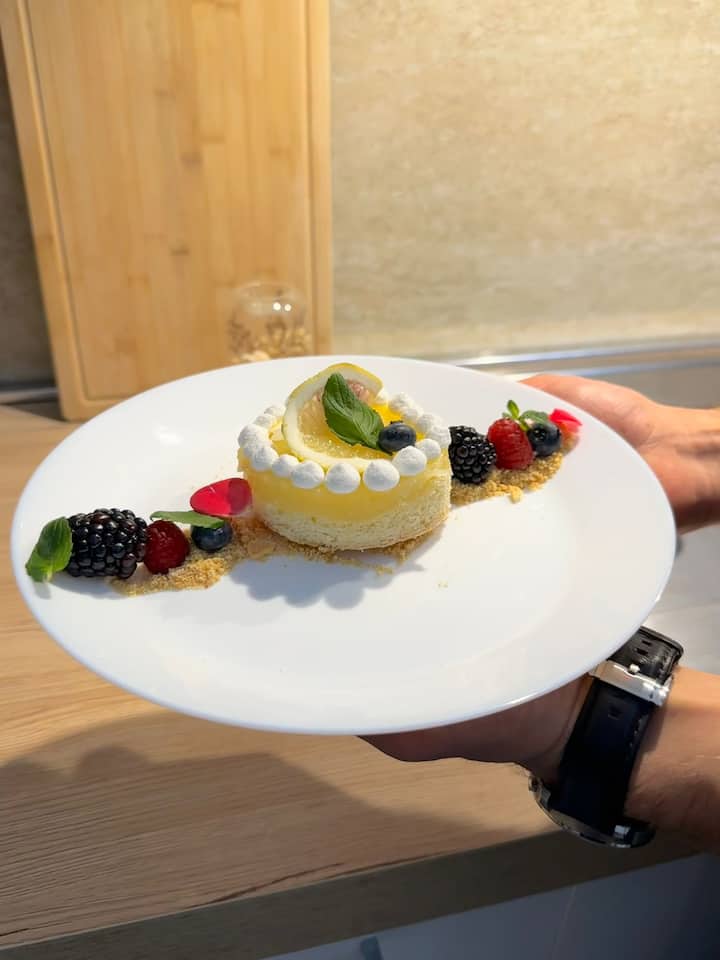 Un viaje gastronómico por el marisco más refinado, con vieiras gratinadas con hierbas y pera caramelizada, risotto de tinta de calamar con burrata y tartar de langostinos, pez espada marinado con miel de menta y una tarta de limón picante. Fresco, elegante e inolvidable.