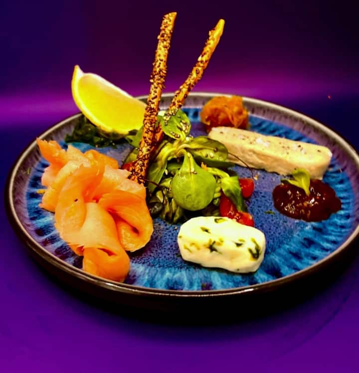 Plato “Tierra y Mar” Foie gras y salmón ahumado acompañados de una florilegia de tostadas y condimentos.