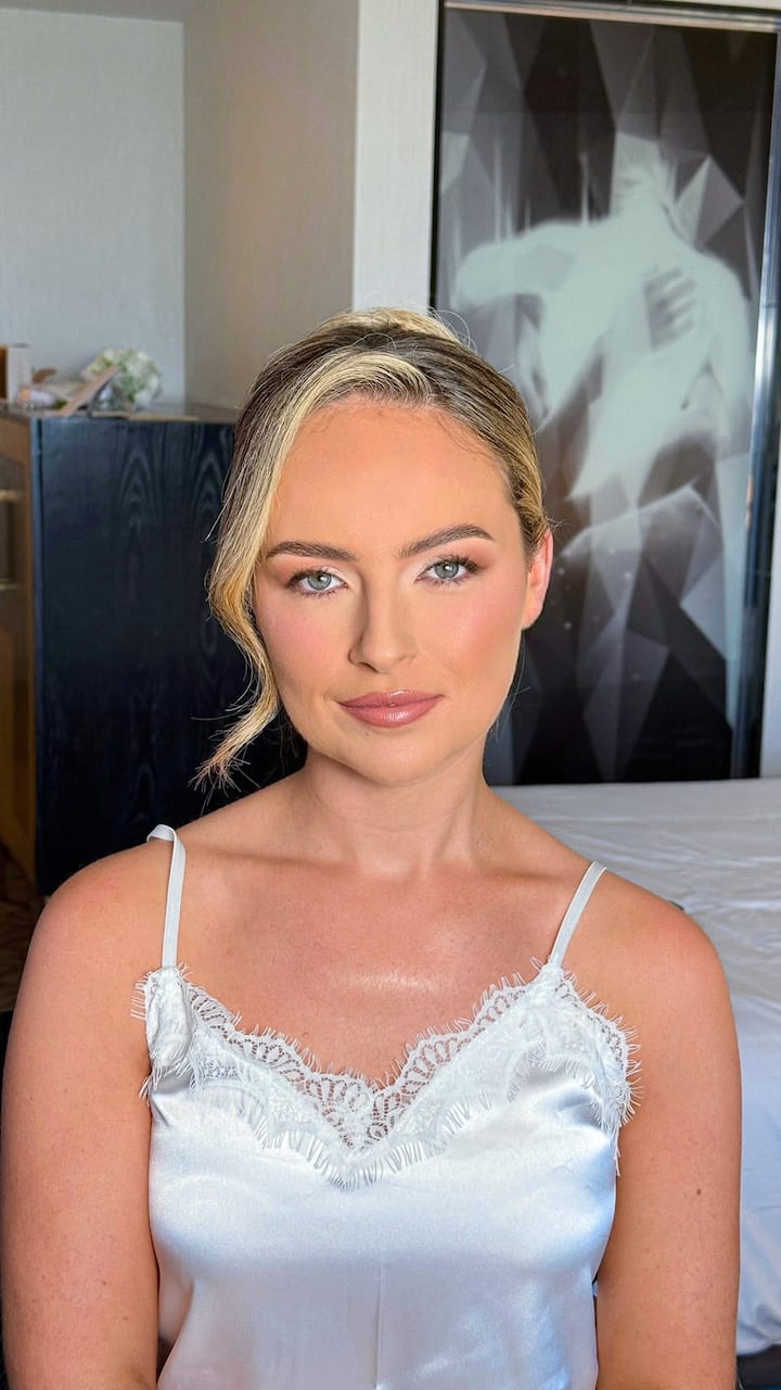 Esta sesión incluye preparación de la piel, base de larga duración, pestañas postizas y sellado resistente al clima de la Riviera Maya.