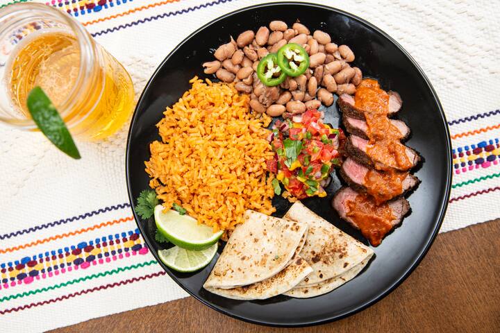 Esta opción de cena comienza con papas fritas recién hechas, salsa, fajitas de pollo, tortillas, arroz español y frijoles. Té dulce y un postre ligero.