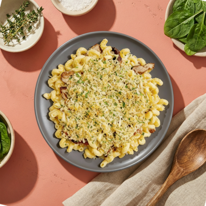 La comodidad clásica recibe un toque abundante y decadente con cavatappi en una salsa de cuatro quesos y rodajas de pechuga de pollo especiada con adobo, todo cubierto con panko de hierbas y queso gruyere y parmesano para un toque extra de nuez. Incluye 1 comida por huésped.