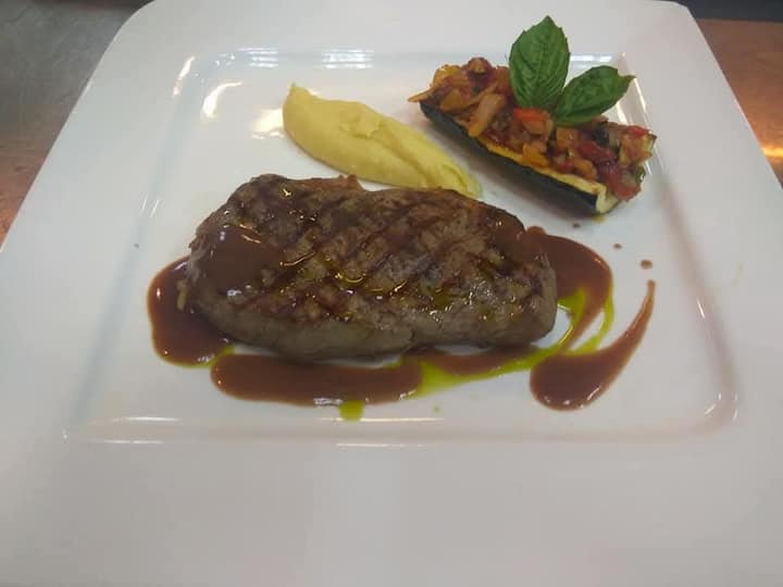 Disfruta de un bistec de costilla servido con puré de papas, verduras variadas y salsa de pimienta negra.