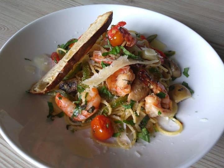 Servido como almuerzo o cena, esto incluye espaguetis con ajo, aceite y peperoncino, langostinos, ajo, chile y pimientos. Otros platos de pasta están disponibles bajo solicitud.