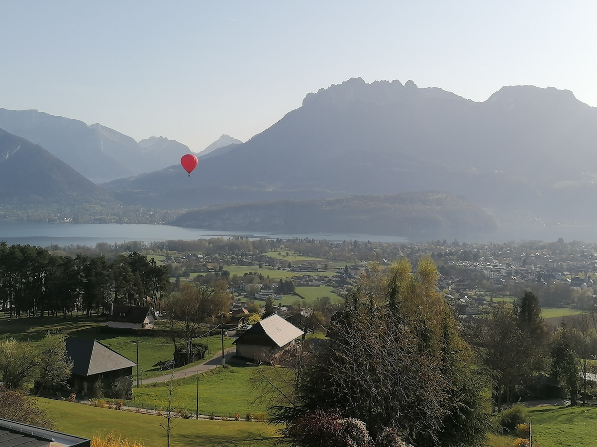 Hélène et Michel vous proposent, à 4 km d'Annecy, une partie totalement indépendante dans leur maison familiale. Cette maison qui jouit d'une vue imprenable sur le lac et les montagnes se trouve dans un cadre calme et verdoyant.