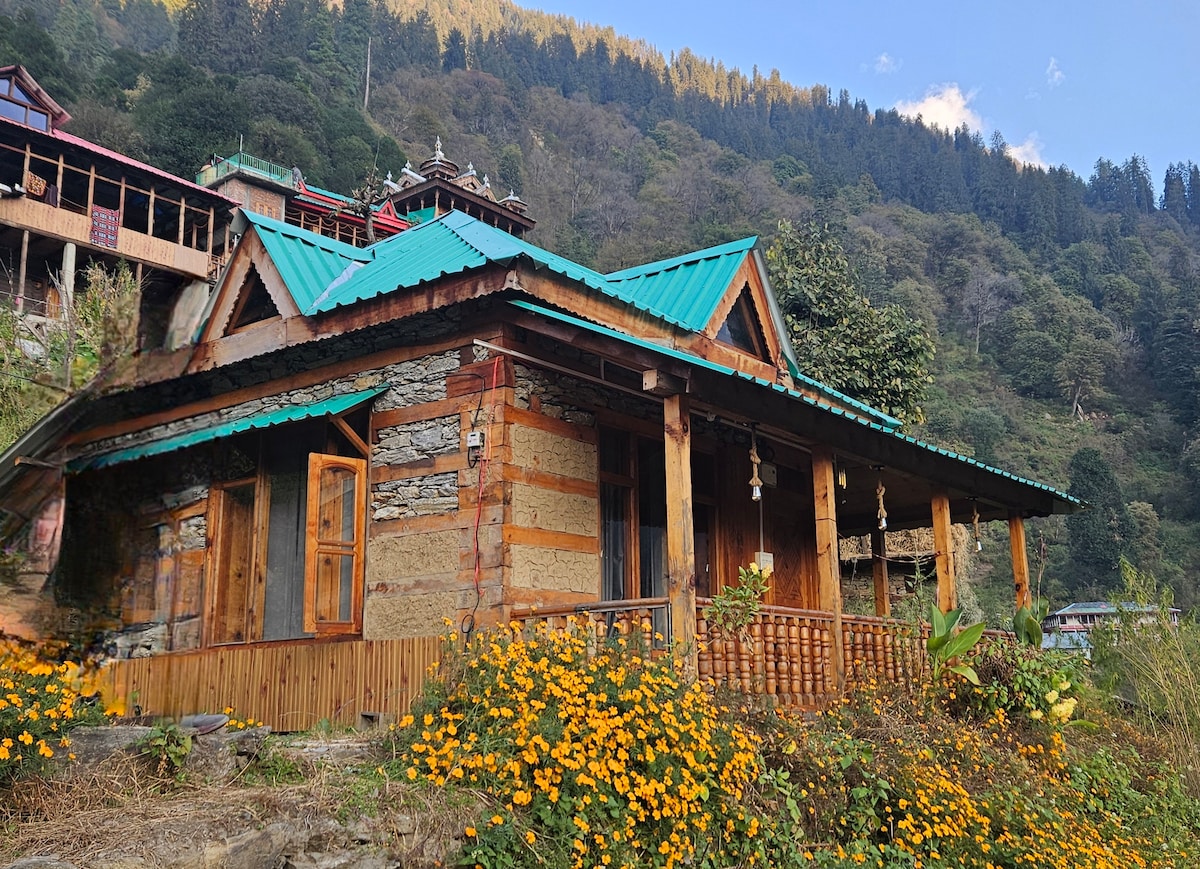 Una cabaña de barro para todas las estaciones construida en estilo tradicional de Himachali con todas las comodidades modernas. La cabaña se encuentra dentro de un hermoso huerto frutal en el borde del Gran Parque Nacional Himalaya. Es un lugar maravilloso para presenciar todas las estaciones, ya sea nieve en invierno, cerezos en flor en primavera o huertos cargados de frutas en verano. La casa de la familia anfitriona del pueblo está a 50 metros de la cabaña. La cabaña ofrece total privacidad y soledad y los anfitriones están a una distancia accesible.