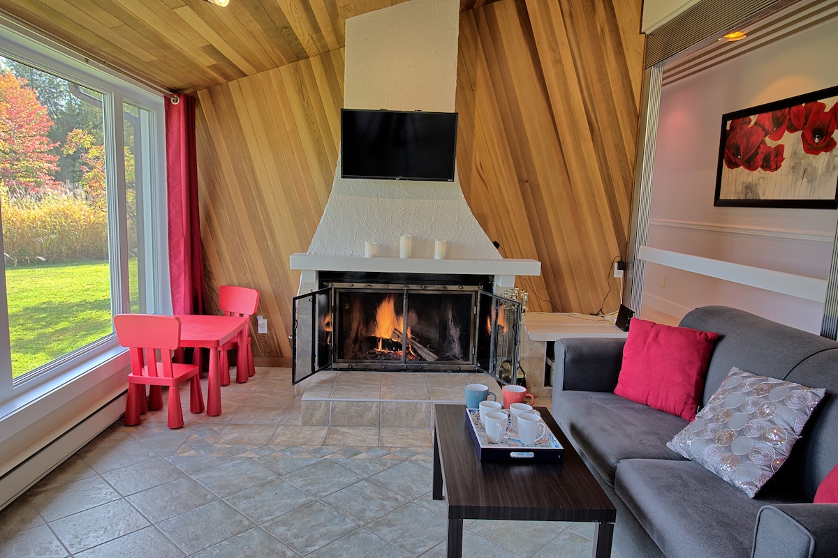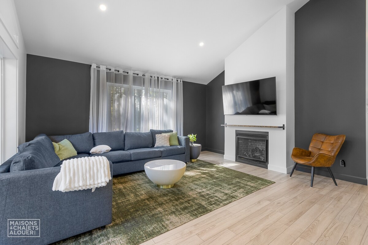 Bienvenue chez vous, que vous soyez une FAMILLE, un couple ou pour venir y travailler en TÉLÉTRAVAIL. Ce chalet complètement équipé saura vous plaire avec ses grandes fenêtres ouvertes sur la nature. Le chalet est près du bâtiment principal où vous pourrez y trouver deux PISCINES CHAUFFÉES (fermée de octobre à mai), un spa, deux SAUNAS et BILLARD. À l'arrière du chalet se trouve le début d'un beau sentier pédestre qui longe un cours d'eau. À proximité vous pourrez y faire plusieurs activités.