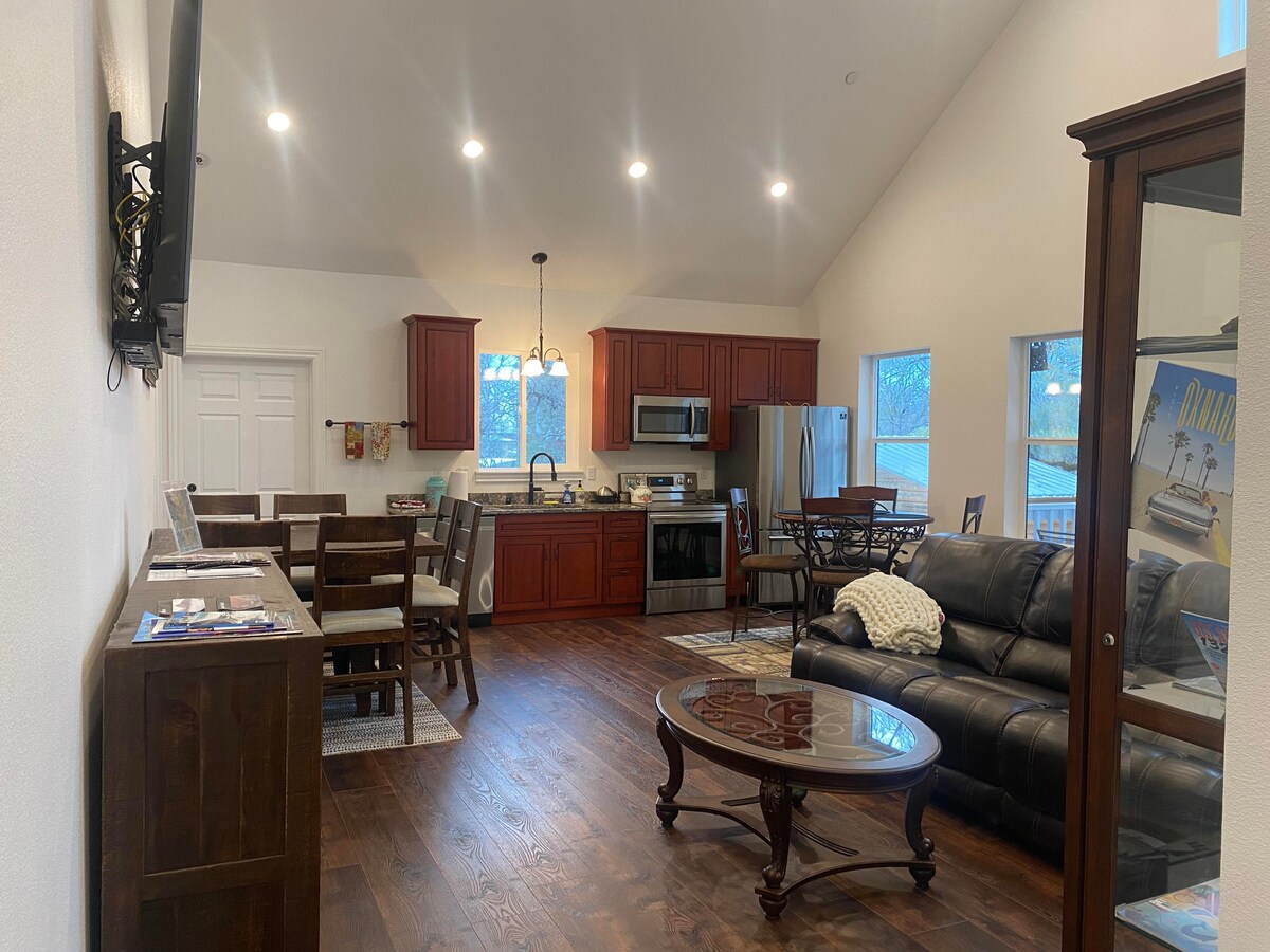In town but feels like country! Private, safe large parking, and patio area with fire pit. Every comfort considered with large king sized bedrooms. Custom kitchenette with stainless appliances and quartz countertops. Linear gas fireplace, custom concrete hearth, 55" HDTV w/ surround sound, and built in cabinets. Custom oversized tile shower with skylight and tankless hot water. Central Heat & A/C. EV Charger! Easy keypad entrance. Close to I-5 & CA-44. Pet free home. COR Permit SDD-2026-00121