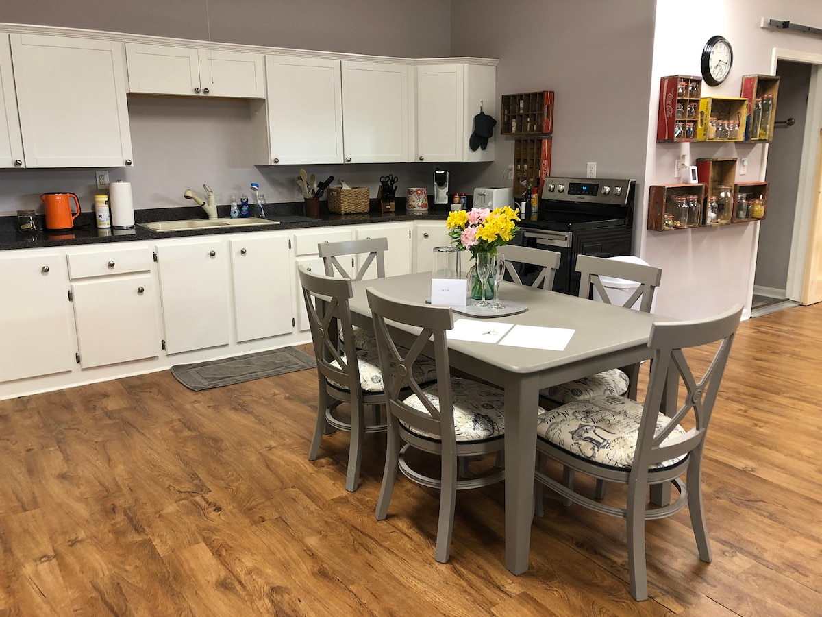 Escucha el canto de los pájaros mientras la pasarela te guía a tu pintoresca escapada a una casa de campo. Disfruta de la naturaleza, ya que estás rodeado de árboles, cerca de nuestro gallinero y un arroyo que fluye desde la cubierta, todo a solo 10 minutos de la ciudad. Se agregaron toques especiales de fotos del Derby de Kentucky, libros, utensilios de cocina, vasos de Bourbon Trail y cabezas de barril de bourbon con destilerías locales. La parte superior de la mesa del comedor está hecha de madera de la propia empresa de destilación Bulleit del condado de Shelby.