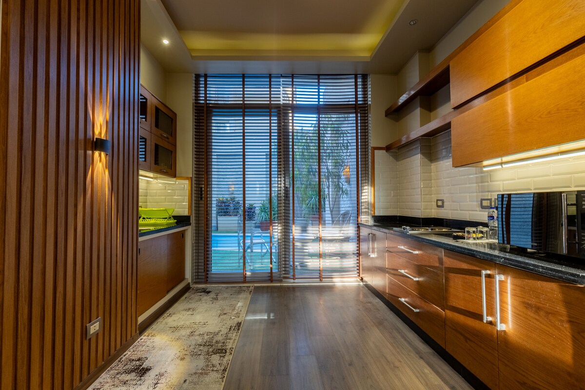 Wake up to the breathtaking view of the ancient Abusir pyramids right before you. Stunning 5-bedroom villa with guesthouse, pool, lush garden, gym, playroom & treehouse. Sleeps 10. Designed by award-winning architect Ahmad Hamid (2010 World Architecture Award), inspired by Hassan Fathy. 20 min to Giza Pyramids & Grand Egyptian Museum. Art collection personally curated by owner Taya Elzayadi. Private chef available for hire. A peaceful family-friendly retreat where history, art, and luxury meet.