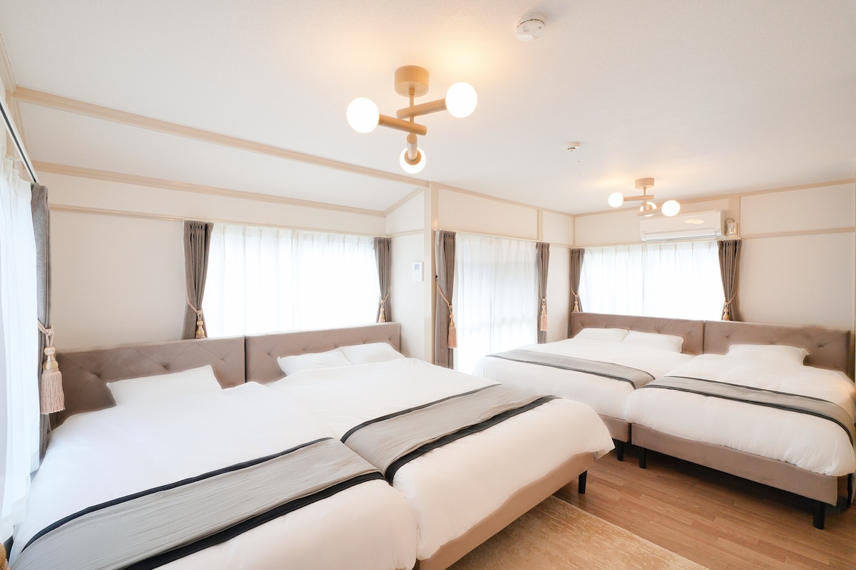 涩谷站徒步6分钟 涩谷十字路口(步行5分钟):打卡全球最繁忙十字路口,感受东京脉搏。 -步行8 分即可到达SHIBUYA SKY(涩谷Scramble Square顶楼):360度俯瞰东京全景(建议提前预约) JR涩谷站 直达 东京 上野 秋叶原 池袋 新宿 大久保 原宿 目黑 品川 成田机场 羽田机场 🛋️ 房间设施与服务 两室一厅一卫生间一间浴室( 干湿分离) 🛏️ 床铺安排 💞主卧:一张双人床 (宽150cm×长200cm)舒适容纳2人。 💞次卧:榻榻米上铺乳胶床垫 (宽150cm×长200cm)舒适容纳2 人。 💞客厅:折叠沙发床 (宽120cm×长200cm)可供第5位房客使用。 📌 提示:使用榻榻米时需被褥折叠到收纳柜里,腾出茶桌摆放 🧺 生活便利 -基础设备:免费Wi-Fi、冷暖空调、微波炉、冰箱、洗衣机、吹风机、熨斗、电视机、电热水壶。 - 免费用品:毛巾、牙刷、洗发水、护发素、沐浴露、面巾纸、卫生纸。 - 厨房用品:基础厨具、煎锅、锅具、碗碟。 🏪 周边设施 商圈内房源,吃饭购物,电车十条线路可用,交通十分便利。