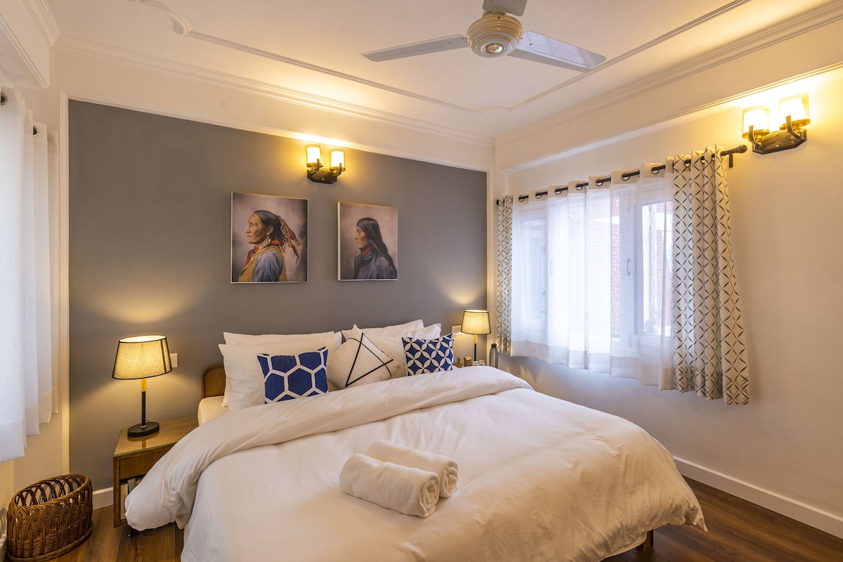 A cozy and well-designed private room nestled in the peaceful hills of Shimla, offering breathtaking views of the surrounding mountains and valleys. Large windows (and sometimes a private balcony) allow natural light to fill the space while giving you a clear view of pine-covered hills and misty landscapes. The room features a comfortable King-size bed with soft linens, a clean attached bathroom, and modern amenities like Wi-Fi, a flat-screen TV, and a dedicated workspace.