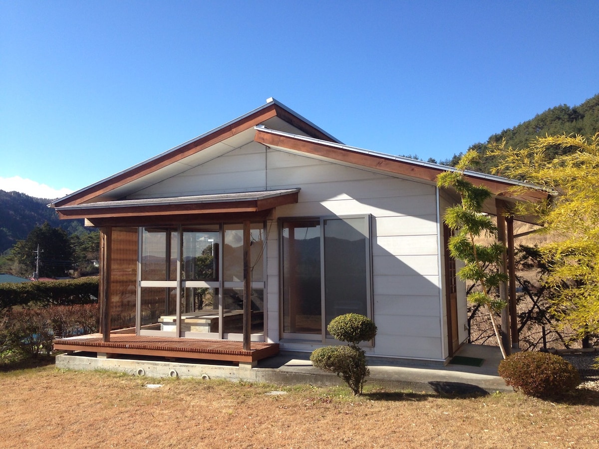 飯田ICから車で約10分で行ける高原の別荘地で、リノベーションハウスを一棟貸しのゲストハウスとしてオープンしました。 豪華ではありませんが、居心地の良い空間を意識してリフォームしています。 冬でも安心。暖かな室内で仲間だけの時間を楽しめます。 住宅地から離れた静かな環境で、人目を気にせずゆっくり滞在できます。 夜は徒歩で行ける展望台や、隣接する湖畔キャンプ場、または庭といったすぐそばで星空が見られる静かなロケーションです。 (※展望台は雪が積もる季節は登れません) 屋内では、Wi-Fiで簡単に操作できるプロジェクターでホームシアターも楽しめます。隣接する民家がないので、いつでも大音量でお楽しみいただけます。 滞在中は84㎡の占有面積をご自由にお使いいただけます。 洗濯乾燥機を無料で使っていただけますので、長期滞在にもお勧めです。 自炊も可能な設備をご用意していますので、旅行プランに合わせた滞在スタイルを楽しんでいただけます。 冬季(1月〜3月中旬)は、施設付近の道路に雪や氷が残ることがあります。お越しの際はスタッドレスタイヤ装着の車と、できれば4WDでお越しください。