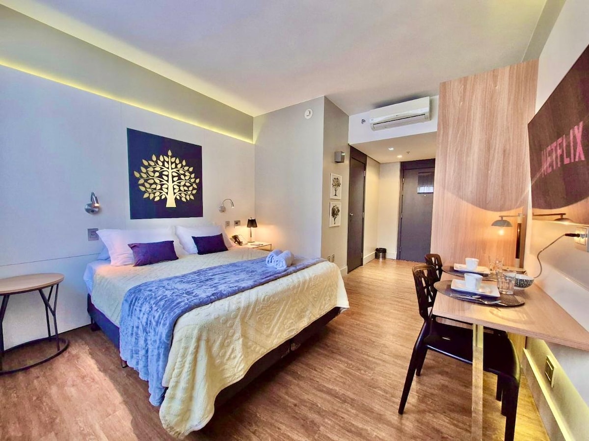 Apartamento aconchegante no Batel, ideal para quem busca conforto e praticidade em Curitiba. Conta com cozinha equipada (mesa de jantar, geladeira, cooktop e micro-ondas), quarto com cama de casal e bancada de trabalho, além de sofá-cama queen. Ar-condicionado quente/frio, blackout para noites tranquilas e ótima localização perto de mercados, farmácias, shoppings e restaurantes, com fácil acesso para quem está sem carro.