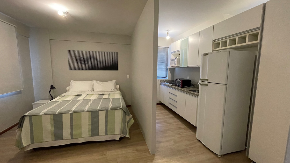 Después de sus horas de trabajo o de ocio, venga a este pequeño espacio más tranquilo, acogedor y con estilo. El kit es muy cómodo, con cama doble, sofá, TV, wifi, aire acondicionado, balcón con hamaca y una cocina con todo lo necesario para preparar una comida rápida. El condominio cuenta con piscina, sauna, gimnasio, sala de juegos y estacionamiento que los huéspedes pueden utilizar sin costo adicional. ¡Te encantará!