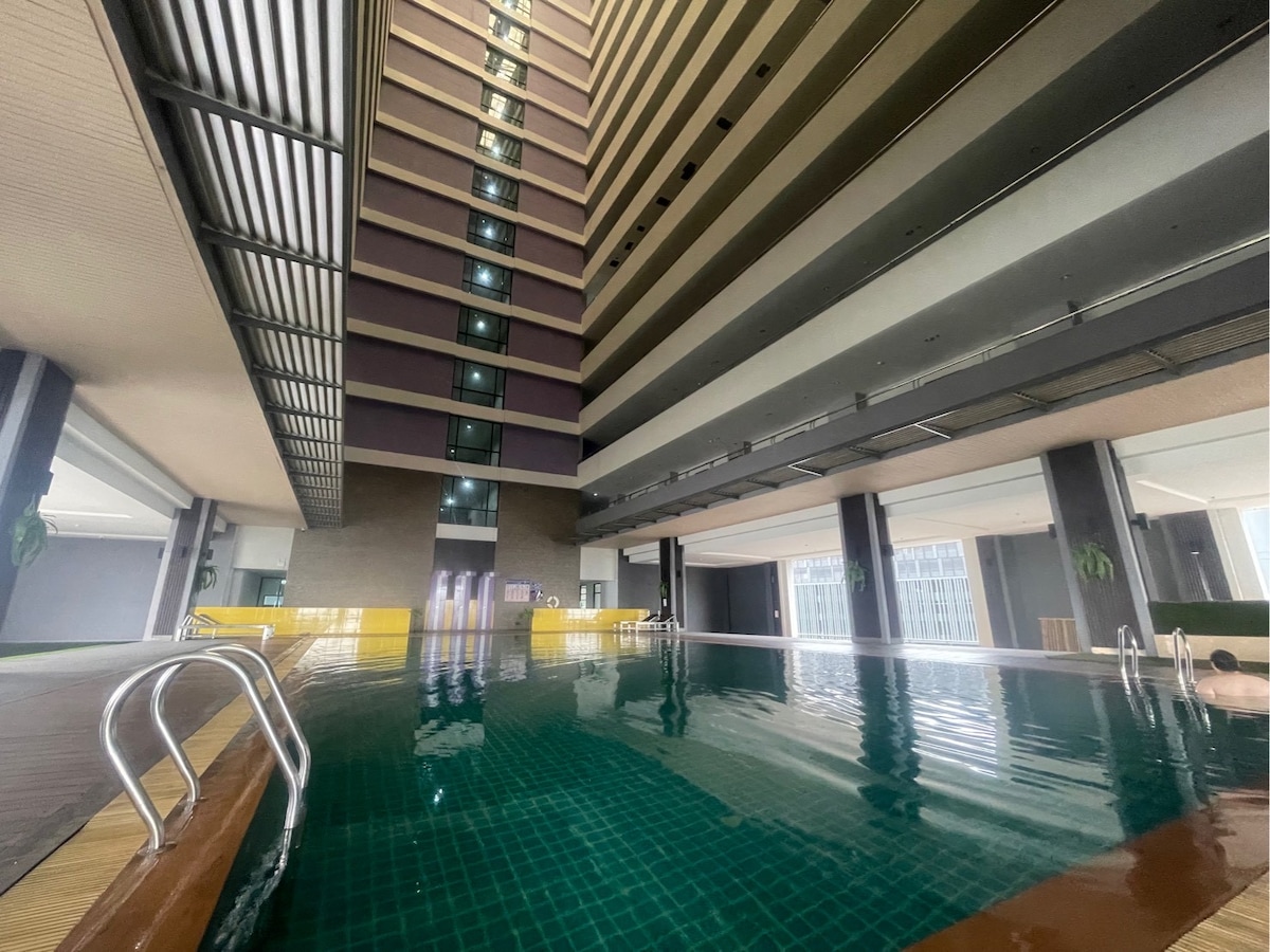 Habitación totalmente amueblada con balcón en el 8vo piso. Vista a la piscina, habitación debajo del jardín de la azotea. Totalmente equipado, listo para quedarse. 1 mesa de comedor/trabajo, cocina pequeña y sofá. Puedes relajarte en la piscina y hacer ejercicio en la sala del gimnasio. También hay una sala de reuniones en el área pública. Ubicado frente a la universidad de Kasetsart, a pocos pasos de la tienda y el mercado complejos. Muy conveniente. A 3 km del polígono industrial Laem Chabang. A 8 km del centro comercial Robinson Si Racha.