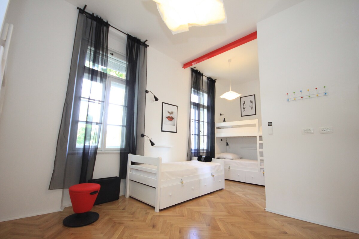 Amplio dormitorio de 9 camas, 2 baños en suite, aire acondicionado, vista de un bonito parque