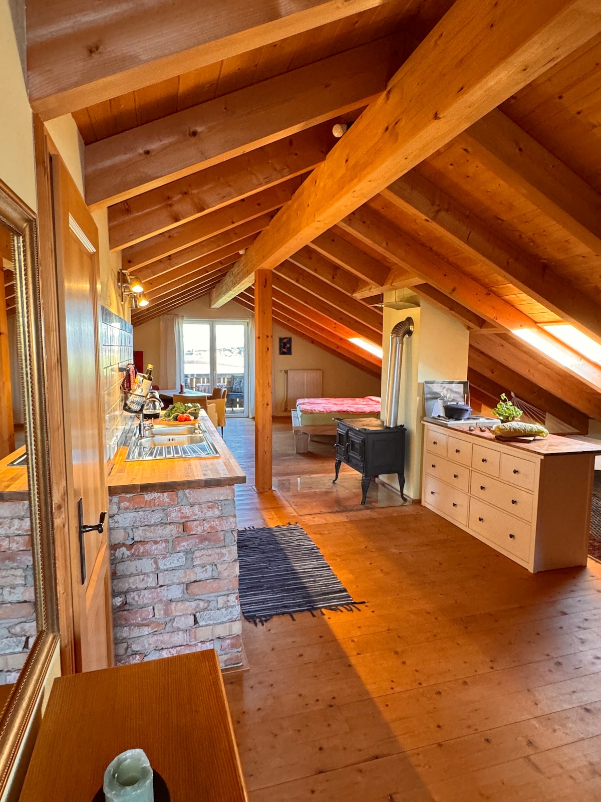 Un pequeño y romántico apartamento en una casa histórica de más de 260 años al pie de la montaña de Untersberg. El pasillo central conecta el salón, la cocina abierta, el baño y un pequeño despacho con un sofá cama. A través de la sala de estar se accede al dormitorio, que está equipado con una cama doble. Una estufa de leña en la sala de estar garantiza noches acogedoras. Un pequeño jardín delantero con juego de comedor te invita a relajarte.