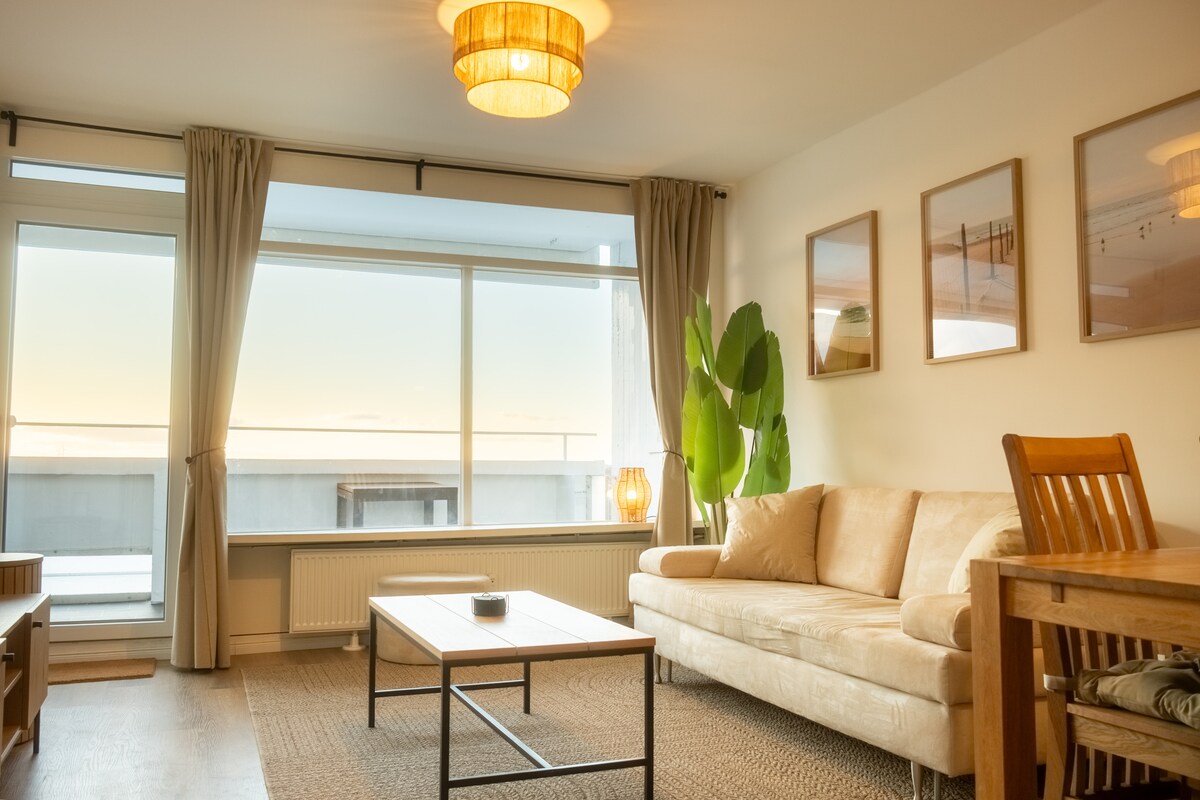 - ¡Vistas al mar, sauna y comodidad pura! - Comienza el día con el amanecer en el amplio balcón, todo ese hermoso sol de la mañana. - A solo 5 minutos a pie a través del parque hasta la playa. - Sala de estar y comedor luminosos, cocina moderna, 1 dormitorio (cama tamaño king + sofá cama). - Wifi rápido, ideal para tu trabajo. - Estacionamiento privado y acceso a la cancha de tenis incluidos; piscina disponible por una pequeña tarifa. - Sauna privado en la terraza con vista al mar: ¡tu refugio personal junto a la costa!