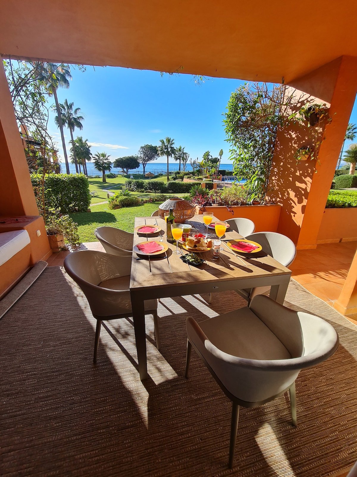 Apartamento totalmente renovado con excelentes vistas al mar en Estepona (Urbanización Bahía Dorada), a 50 metros de la playa. Ideal para una pareja pero con capacidad para 4 personas (1 cama de matrimonio en el dormitorio y dos sofás cama muy cómodos en el salón). Está situado en un entorno tranquilo y muy bonito, con piscina y pk en la urbanización. Está a 7 minutos en coche del centro urbano y 2 del supermercado. Está cerca de Marbella, Gibraltar, Sotogrande, Ronda y otros destinos de interés