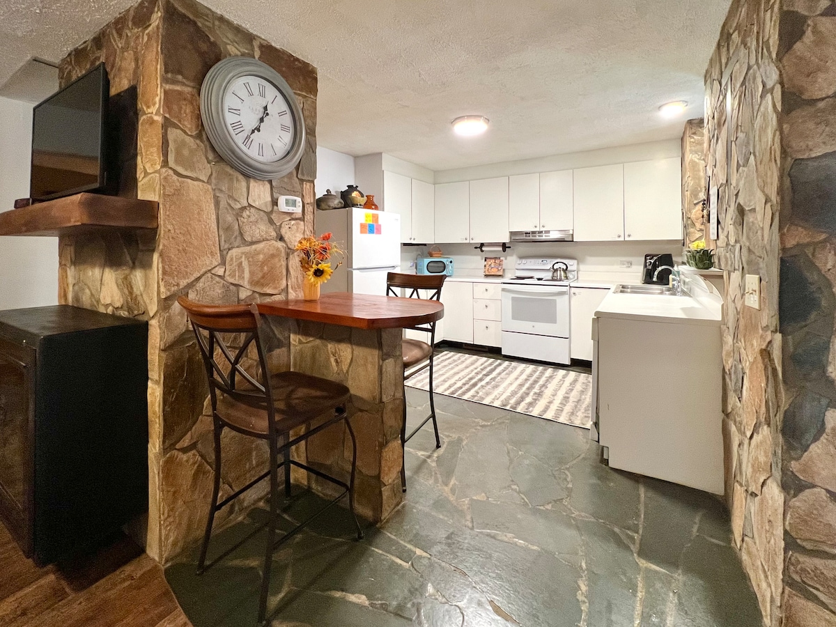 Connect with nature in this unforgettable farm setting. Take in serene views from the deck or walk around to enjoy a variety of sweet animals including sheep, horses, goats, alpacas, emus, cows, ponies and more. The space is a fully furnished apartment in an adorable stone cabin with one queen bedroom, kitchen, full bath, laundry, high speed Wi-Fi, and outdoor hot tub. Upper cabin is also available as a separate rental (sleeps 5) listed as Log Cabin at the Farm on Airbnb.