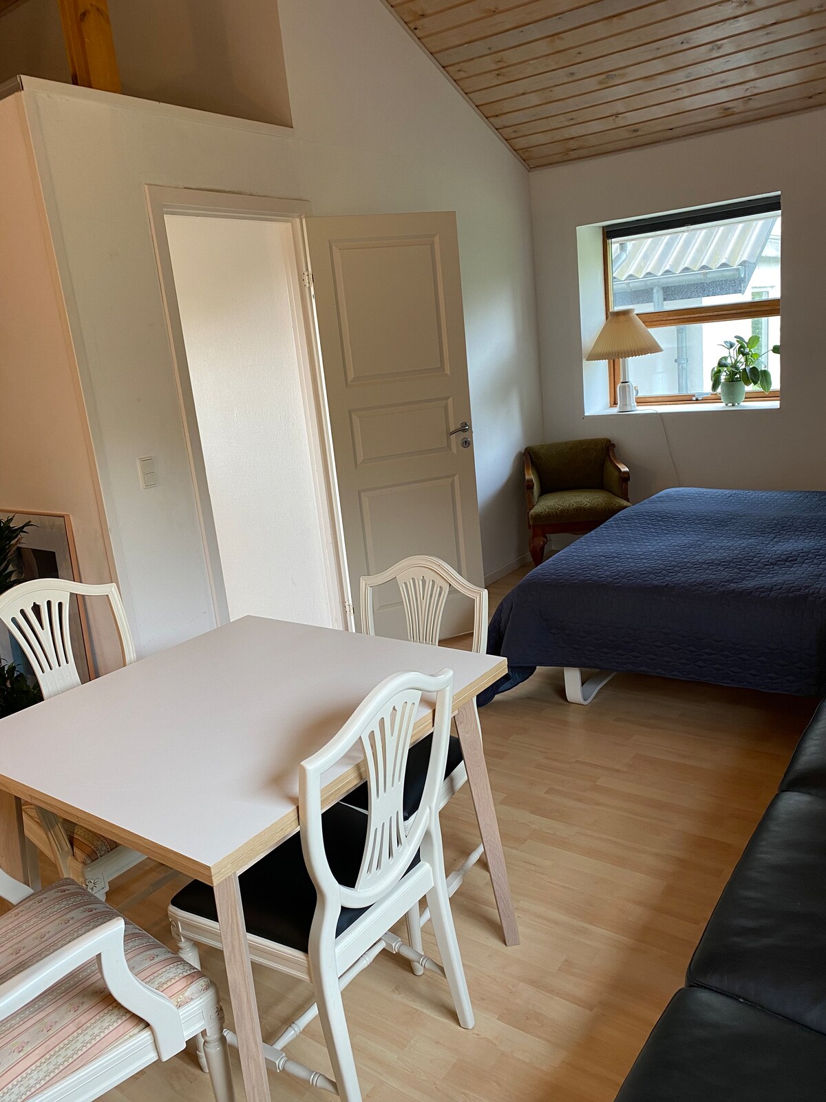 Habitación grande y luminosa recientemente renovada en 1 piso con fantásticas vistas (y con la posibilidad de 2 camas adicionales además de una cama doble además de una cama doble) y una habitación más pequeña recientemente renovada con techos abovedados en la planta baja, también con bonitas vistas y cama doble. También hay una gran sala de estar con la posibilidad de "cine" hygge con un gran lienzo, un juego de futbolín o simplemente relajación pura con un buen libro. El baño está en la planta baja. Hay un bonito sofá cama y buenos colchones de caja.