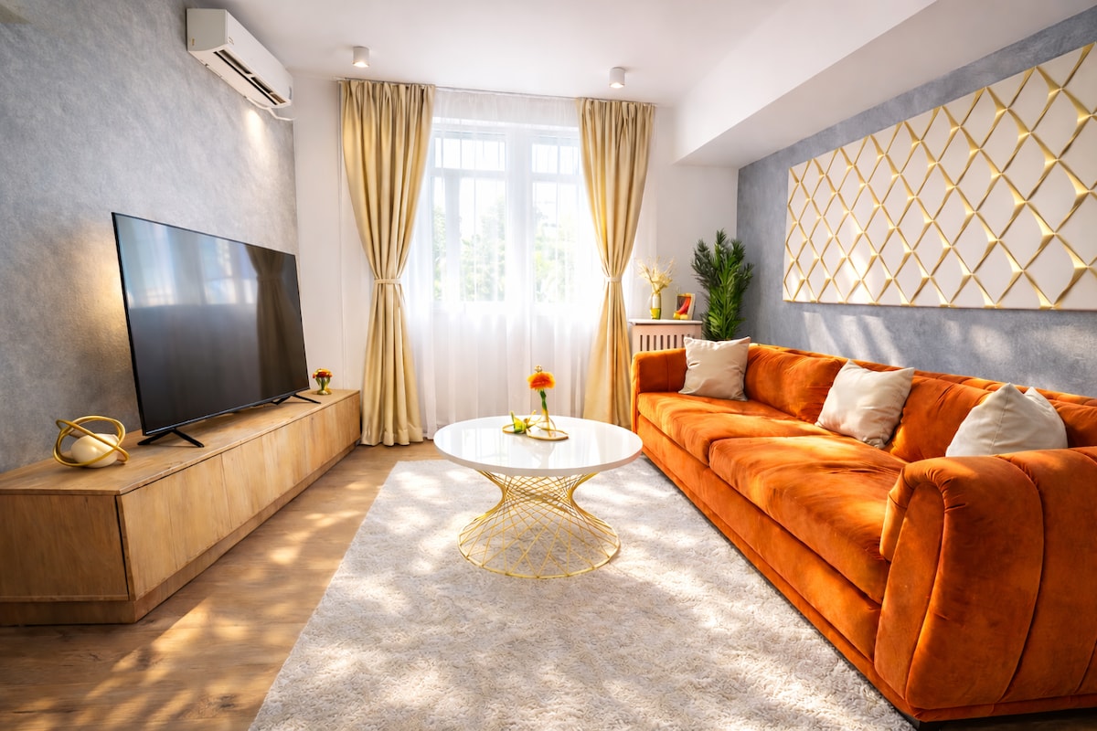 Urban Deluxe on Calea Victoriei, Bucharest city center: premium modern apartment on the city’s main boulevard, with a private glass sauna in the living room, a freestanding bathtub in the bedroom and ambient lighting for a romantic vibe. Sleeps 4 (queen bed plus sofa bed). Fast 1 Gbps Wi-Fi for workation, Smart TV, fully equipped kitchen, balcony, washer and dryer, easy self check-in. Walk to Old Town, Romanian Athenaeum, museums, metro, restaurants and cafes in minutes. Everything is walkable.