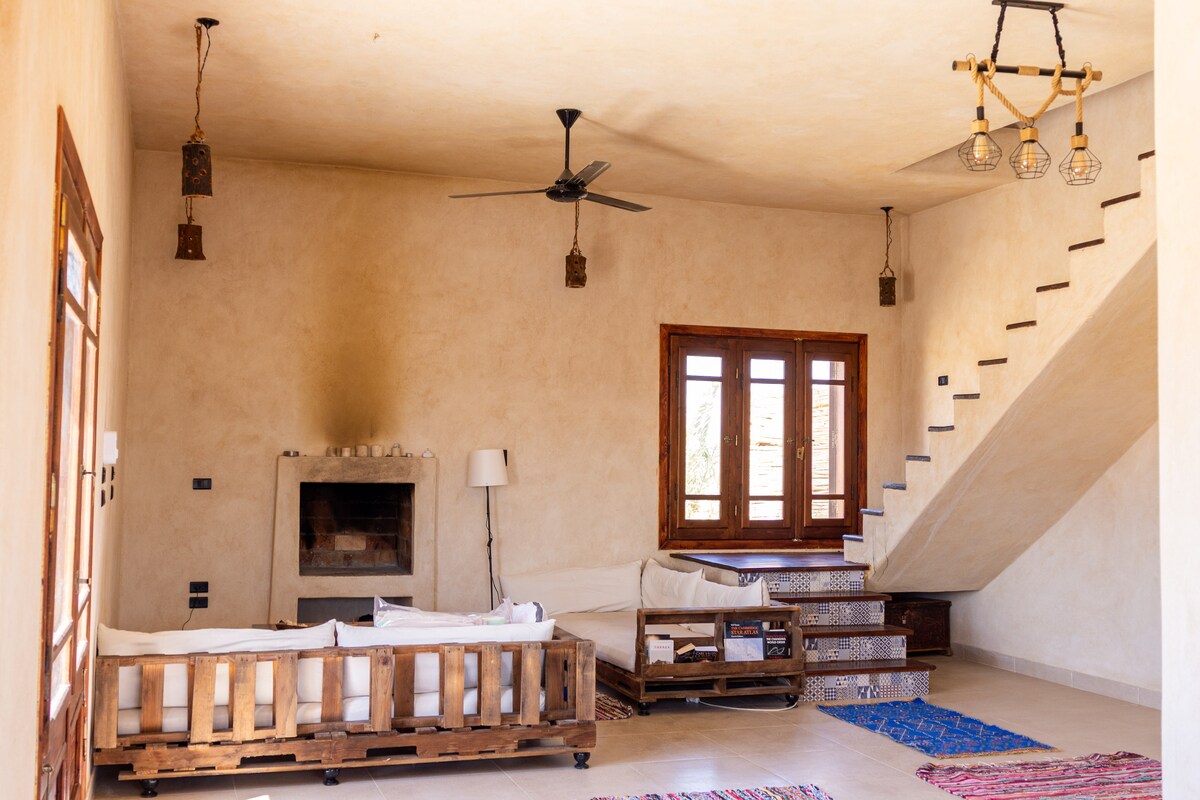 Restored traditional Siwan house in old town behind Shali. 5 mins to shops, bus stop, restaurants, yet a quiet neighbourhood. Huge roof terrace with firepit. Broadband 37 Mbps. 4g 15-25Mbps. Weekend trips out in Land Cruiser to edge of the desert/hot springs included.