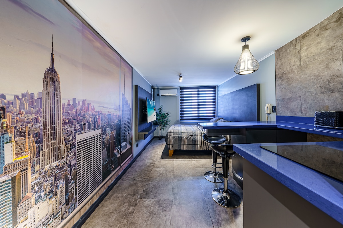 Studio diseño moderno, ThermoPanel para aislamiento acústico y térmico, aire acondicionado. Ubicado en la mejor zona de Santiago. A pasos de estación Metro Tobalaba, mejores restaurantes de Santiago, del Costanera Center Mall, cafés. Excelente wifi, TV por cable, Smart TV de pantalla curva de 55 ", lindo baño. Todo en un barrio seguro y con muchos servicios. Por razones de seguridad, es requisito enviarnos, luego de reservar, fotos del documento de identidad y selfie de cada huésped.