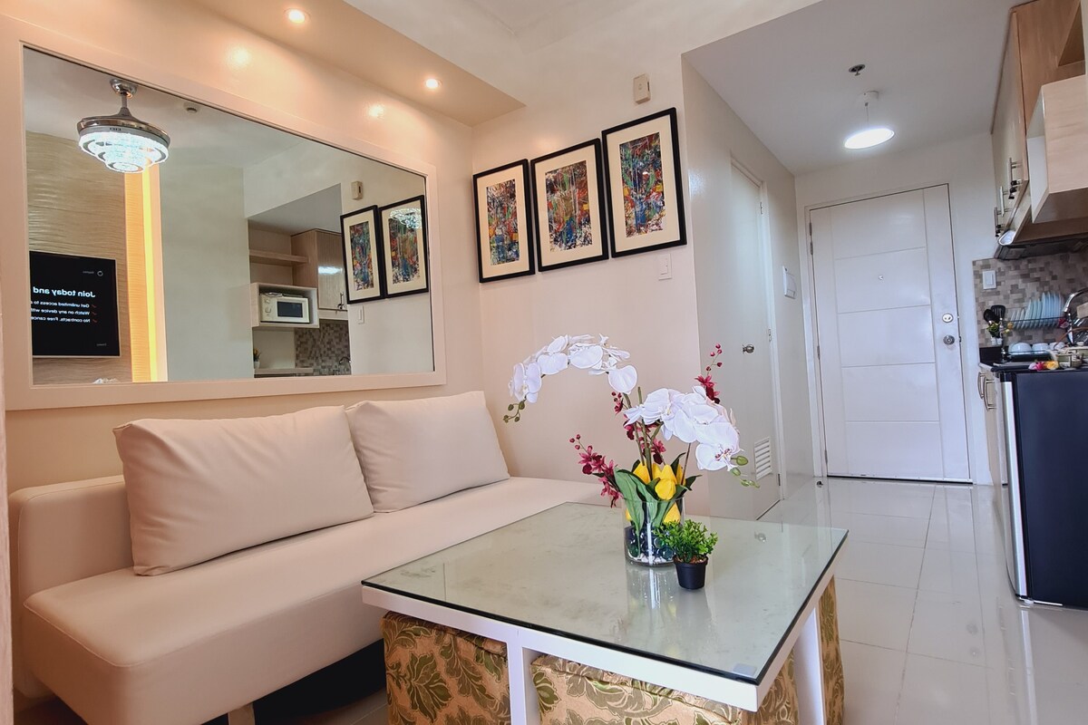 Un espacio encantador para desconectar y relajarse después de un ajetreado día de trabajo. Disfruta de la comodidad y tranquilidad de este apartamento contemporáneo de 1 dormitorio. El apartamento tiene una combinación de colores monocromática con partición de vidrio templado y superficies de madera. Disfruta de Netflix en un cómodo sofá o pasa un rato en el balcón para disfrutar de la brisa fresca y el clima acogedor de Tagaytay. También puedes pasar un tiempo admirando las impresionantes vistas panorámicas del lago Taal en el Sky Lounge al que pueden acceder los huéspedes.