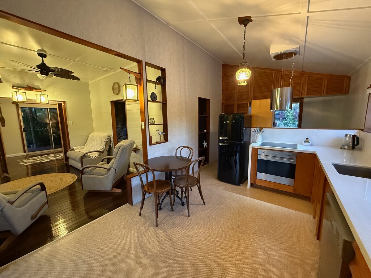 Relájate en esta escapada única y tranquila. Sentí cómo se reduce tu presión arterial cuando entres en esta casa de campo de estilo náutico que acaba de recibir una nueva capa de pintura y algunas mejoras. La casa está rodeada de hermosos jardines tropicales exuberantes y floridos que harían que tu Nanna y los observadores de aves se desmayaran, incluida una amplia variedad de orquídeas. La casa está completamente vallada, a 200 m de la torre de agua pintada, a 900 m de la playa patrullada y a 50 m de hermosas puestas de sol acuáticas.