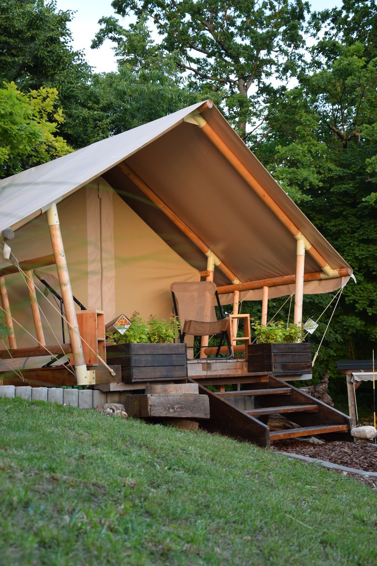 Carpa de glamping en un huerto