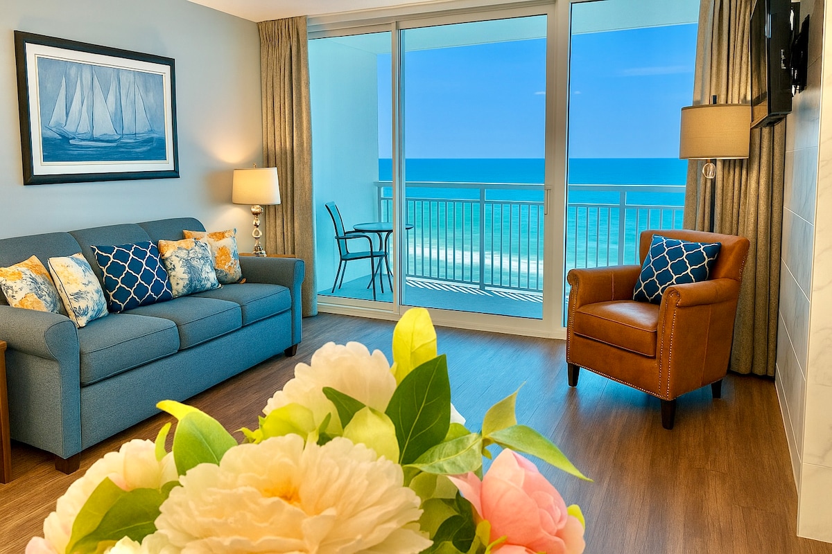 Enjoy Ocean Views from Private Balcony - Keurig K-pod and Drip coffee Makers - Comfortable Bedroom: Two cozy queen-sized beds. - Sleeper Sofa: In the living room. - Fully Equipped Kitchen - 55" Smart TV in Living room and Bedroom Resort Amenities: - Indoor/outdoor pools - Hot tubs - Lazy river. - Fitness Center: - Free Wi-Fi - Stay Connected - Direct Beach Access - On-site attached parking available. - Central Location: - Close to Myrtle Beach Boardwalk, SkyWheel, and local attractions.
