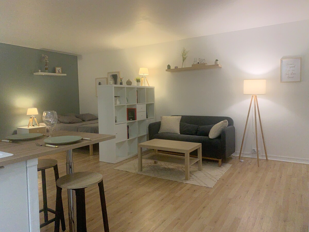 Encantador estudio reformado. Cuenta con una zona de dormitorio real con una cama tamaño queen (160 x 200). Una cocina amueblada y equipada. Smart TV con provisión de una cuenta de Netflix, Prime Video y Molotov. Para hacer su noche o estancia más agradable se proporcionan sábanas y toallas. También podrá relajarse en el pequeño jardín privado sin vecinos equipado con una barbacoa de carbón. Aparcamiento en patio privado cerrado con portón.