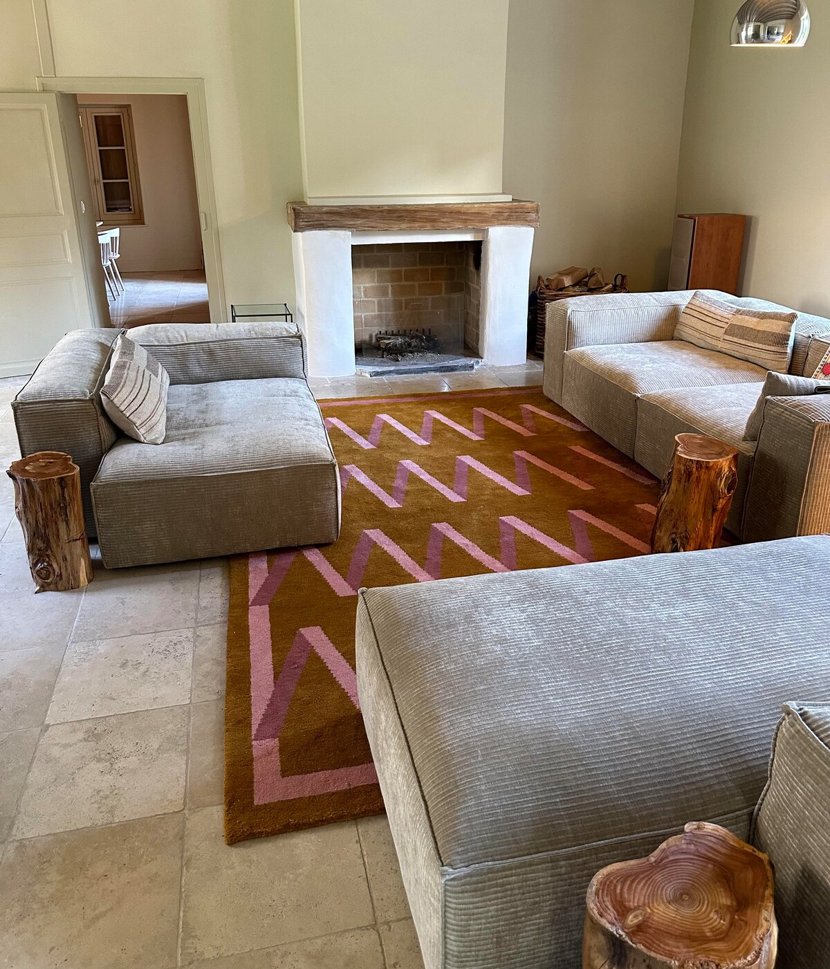 En el campo: parque arbolado, chimenea, baldosas, vigas