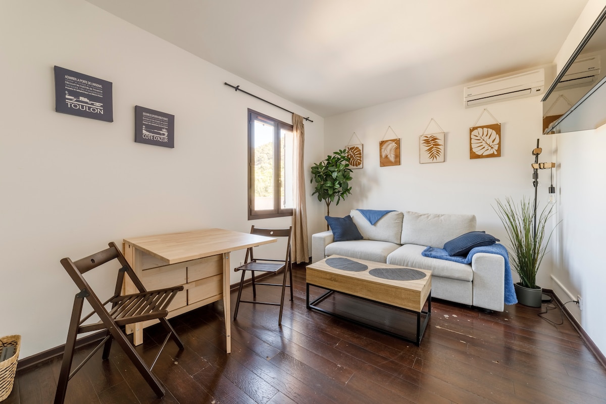 Pequeña casa atípica en un callejón sin salida muy tranquilo planta baja y entrepiso Sistema de climatización jardín sombreado/barbacoa - zona de comedor estacionamiento frente a la casa 2 lugares PLAYAS 3 minutos a pie de la Verne (vigilada) 10 minutos a pie Fabregas (restaurante) 10 minutos en auto de Sablettes (restaurantes, bares, parque de atracciones, mercados, entretenimiento) Domaine de Fabregas a 10 minutos a pie (paseo por el bosque, productor ecológico) Pequeños comercios a 5 minutos en auto - supermercado a 10 minutos se admiten animales OPCIONES de limpieza y ropa de cama