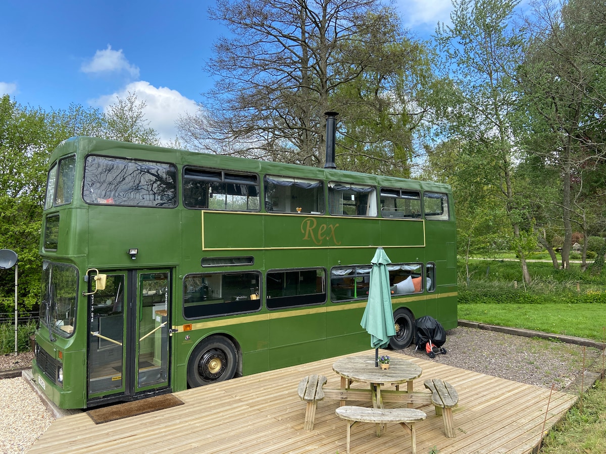 «Rex the Bus» es único, divertido y un poco peculiar. Este autobús de dos pisos se ha convertido al más alto nivel y se ha conectado a la red eléctrica, al agua y al desagüe. Disfruta de vistas panorámicas al campo desde las ventanas, contempla el amanecer desde tu cama doble o litera. La calefacción y una estufa de leña te mantendrán caliente y acogedor, mientras que la zona de cocina ofrece mucho espacio para preparar una deliciosa comida. Hay una ducha en la planta baja y un inodoro y un lavabo en la planta superior.
