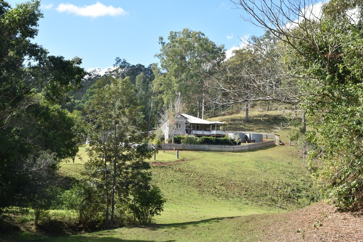 Situada a solo 10 minutos de Dayboro, esta es una casa de campo de Queensland de 1920 bellamente restaurada con vistas inigualables del valle de Lacey's Creek. Situado en la cima de una cresta en una granja de trabajo de 110 acres con numerosas rutas a pie para explorar y muchas vistas increíbles. Alojamiento patrimonial, con 3 dormitorios, una gran sala de estar, cocina completa y baño bellamente restaurado. Siéntate en tu propio balcón privado y disfruta de la puesta de sol sobre el valle con una brisa fresca de tarde siempre presente.