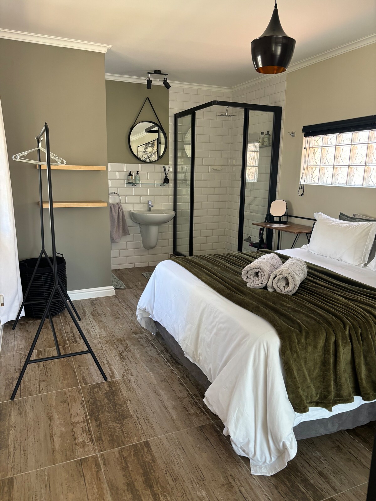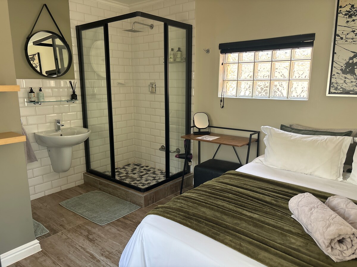 Bienvenido a Habitación con vistas en Rome Glen, Somerset West. Esta tranquila habitación en una casa de huéspedes ofrece impresionantes vistas a la montaña, perfecta para un retiro tranquilo. Cuenta con una cómoda cama king size, baño privado, nevera, caja fuerte y TV. Grandes ventanales llenan el espacio de luz natural. Los huéspedes tienen acceso a una piscina compartida y a una zona braai con impresionantes vistas panorámicas. Disfrute de estacionamiento seguro, Wi-Fi