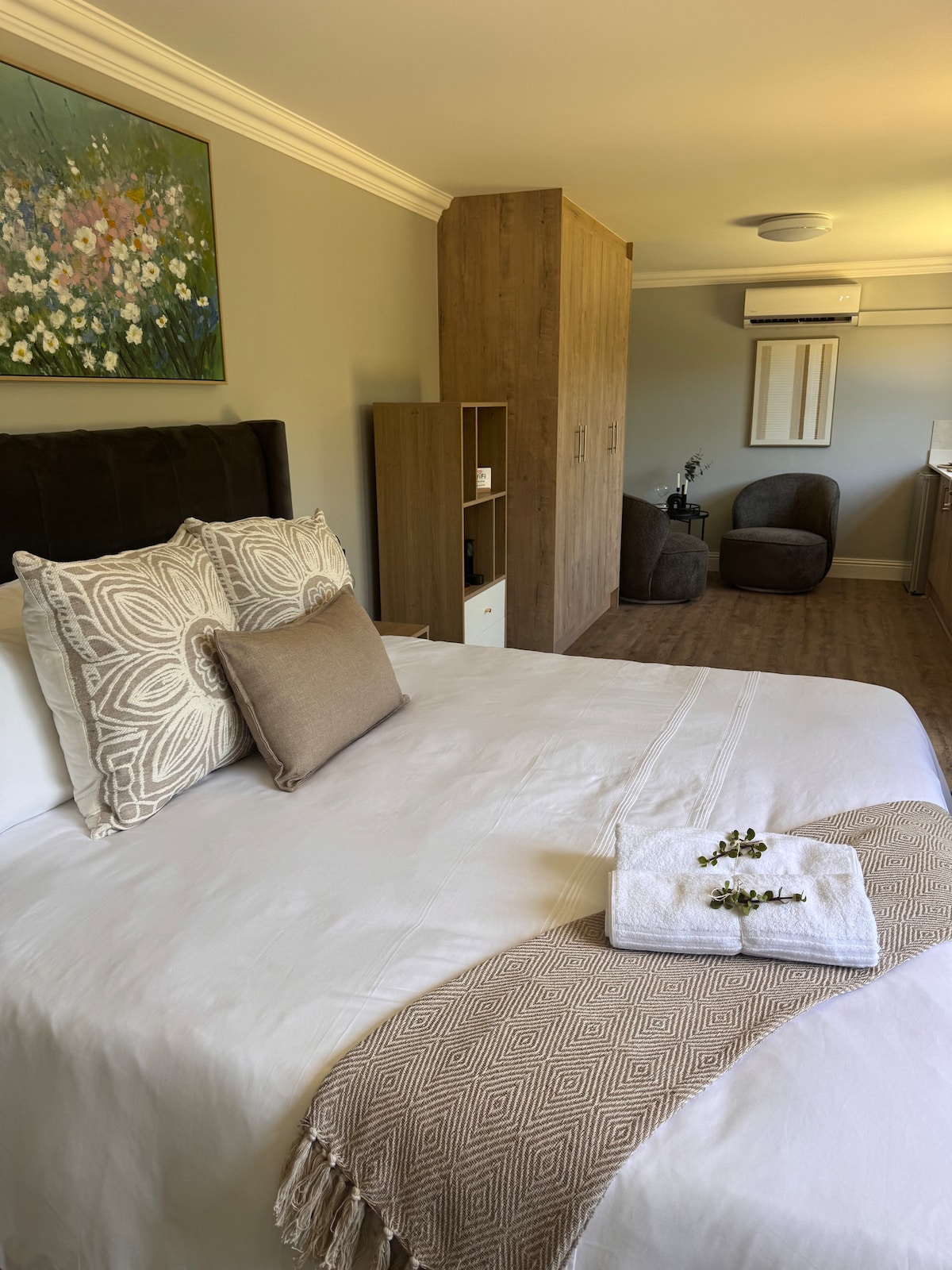 A tranquil indoor-outdoor living space ideal for couples or business travelers. The stylish studio opens up onto a large patio with braai. Enjoy our long summers outdoors! The studio has a separate entrance from the main house. Queen bed with open walk-in shower & separate toilette . It has fiber WI-FI, full DSTV, a tiny kitchenette with tea/coffee facilities, toaster, microwave, fridge & single induction plate. Secure onsite parking. We have 2 Small dogs for added security.