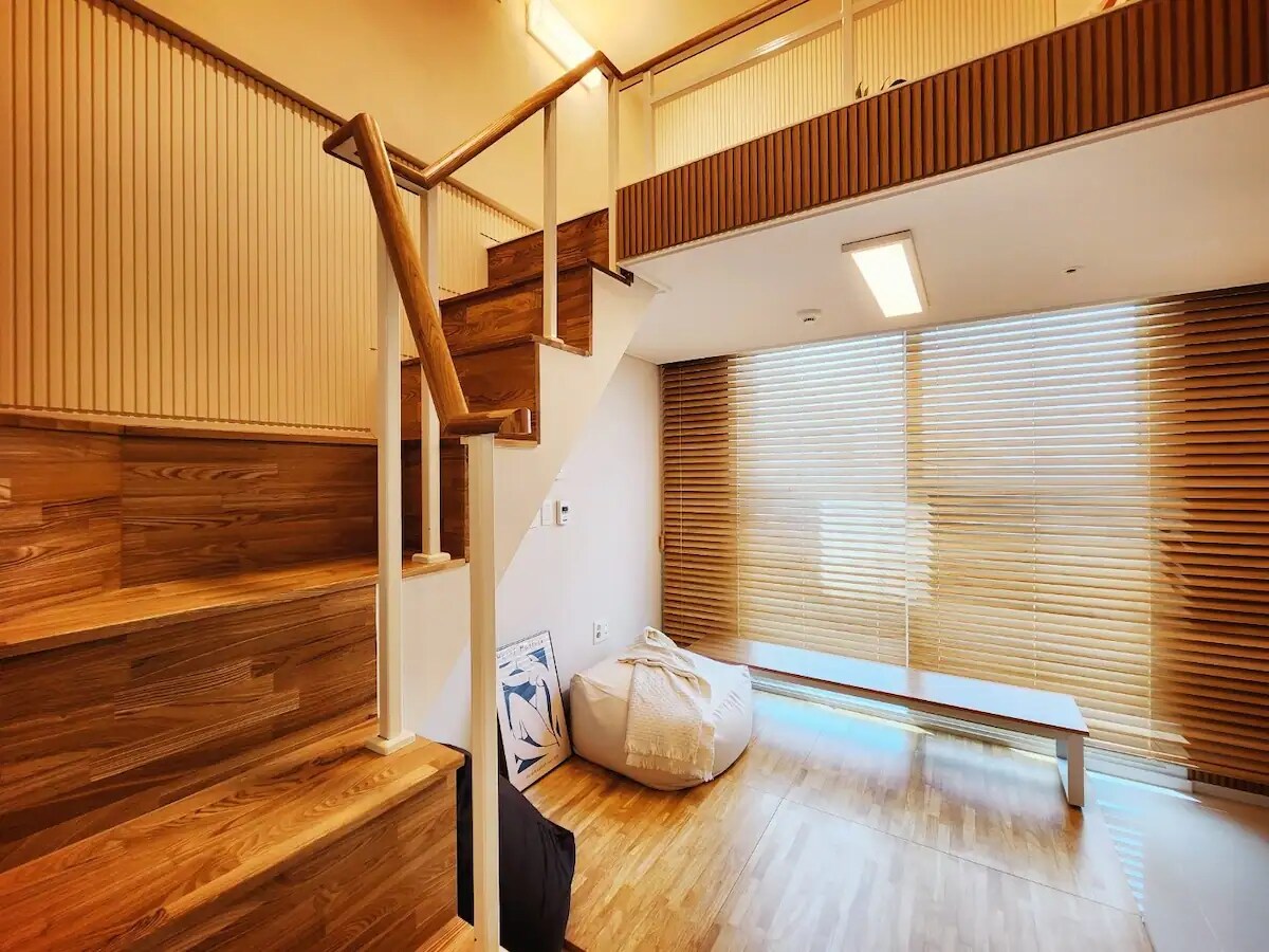 Piso alto con vistas al mar y al parque, Vista al mar desde la ventana donde los dos lados están fríamente perforados, Amplio y aireado estudio dúplex, Alojamiento emocional interior de ratán:) Ventana ▪️de doble cara con vista al mar, vistas al parque ▪️Dúplex, techos altos, apertura fresca Aeropuerto de▪️ Incheon a 20 minutos en auto ▪️Gueup Batter a 2 km 6-7 minutos en coche ▪️Netflix Tiene ▪️capacidad para 8 personas ▪️Horas de uso - Llegada: 4:00 p. m. - Salida: 11 a. m. * El registro anticipado/salida tardía requieren cargos adicionales y programación, así que ponte en contacto con nosotros por adelantado. No se ▪️admiten mascotas. Está absolutamente prohibido fumar en ▪️interiores ▪️No se permite la parrilla de panceta de cerdo, la carne/pescado/camarones no se pueden hornear, la sopa de cangrejo/maeuntang no se puede cocinar con olores fuertes, etc. ▪️Estacionamiento (1 auto gratis) - Edificio B1 ~ B4/Estacionamiento: conexión de alojamiento (hay un costo adicional para más de 2 autos)