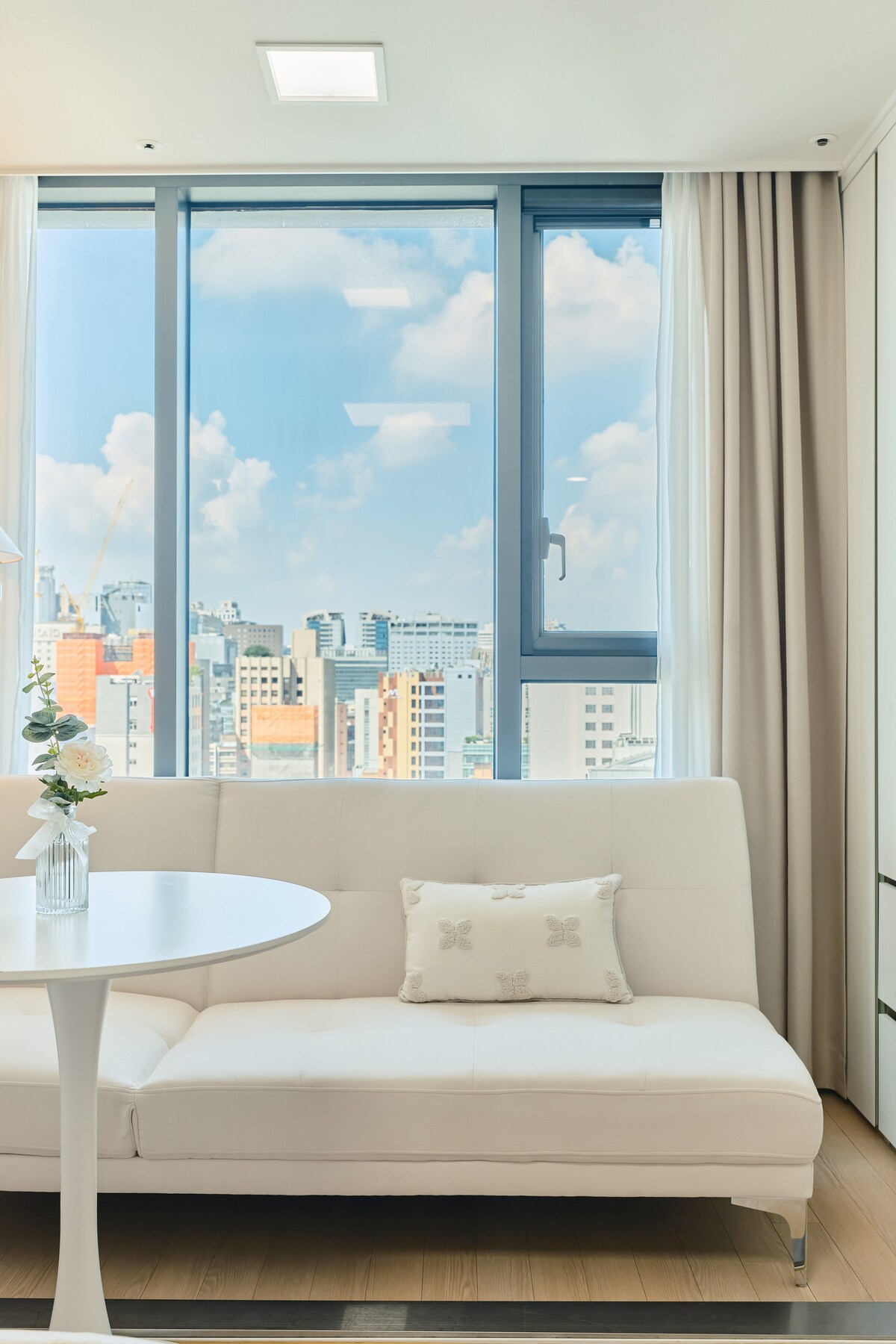 SEOUL SKYLINE from TOP FLOOR Panoramic Landmark : Hangang River, Seoul N Tower, and Lotte Tower On the Move: Walk 10 secs to Bongeunsa Station (Line 9), 10mins to Samseong Station (Line 2) From Airport: Take AREX and Line9, or Airport Bus Urban Essentials: COEX Shopping Mall, Grocery Shops nearby Cultural Connection: 5 mins to the historic Bongeun Temple (Oldest temple: Founded in 794) Design Touch: This place was designed and renovated by K-pop Star, Got7