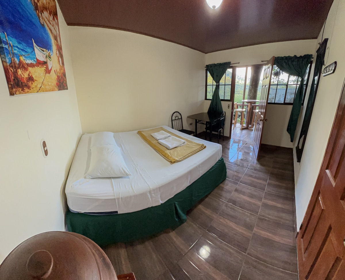 Habitación privada con terraza y vista natural, ideal para quienes buscan tranquilidad y un espacio propio al aire libre. Cuenta con cama matrimonial, baño privado y acceso independiente dentro del Resort. La terraza permite disfrutar el aire fresco y momentos de descanso en un entorno sereno. Incluye desayuno para comenzar el día con calma y energía.