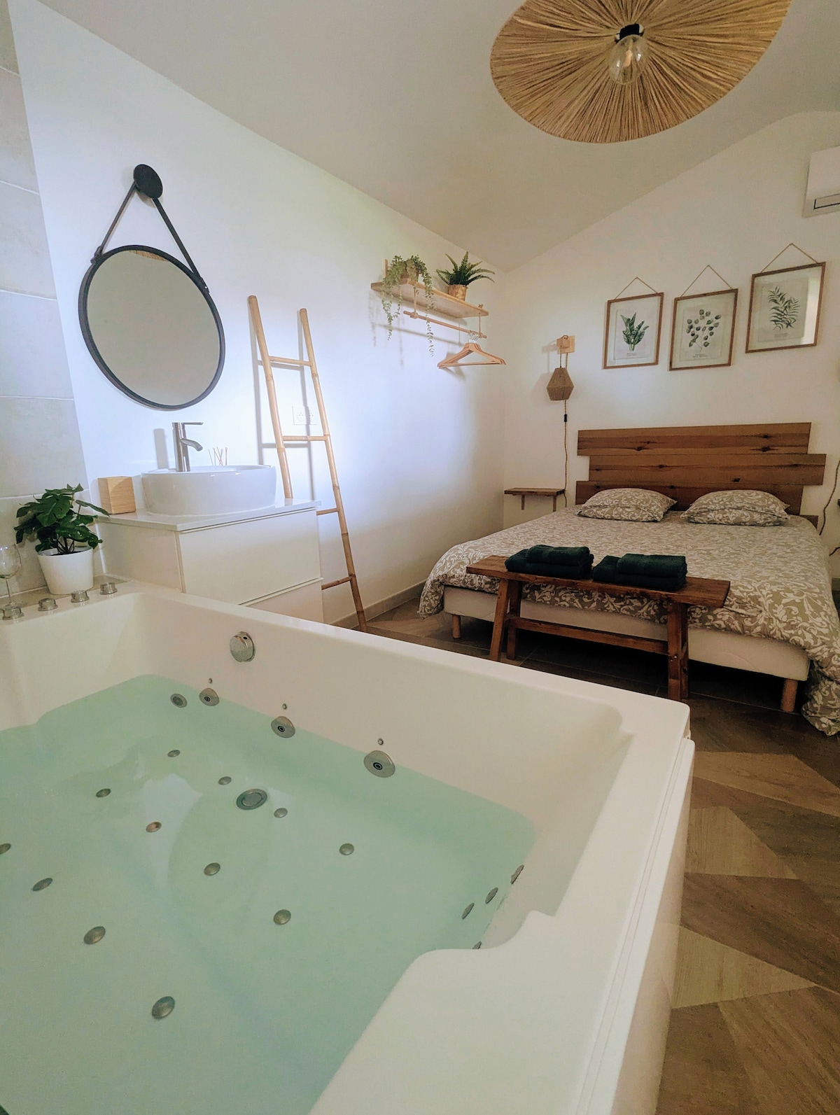 Espacio de relajación con bañera de hidromasaje y proyector de video