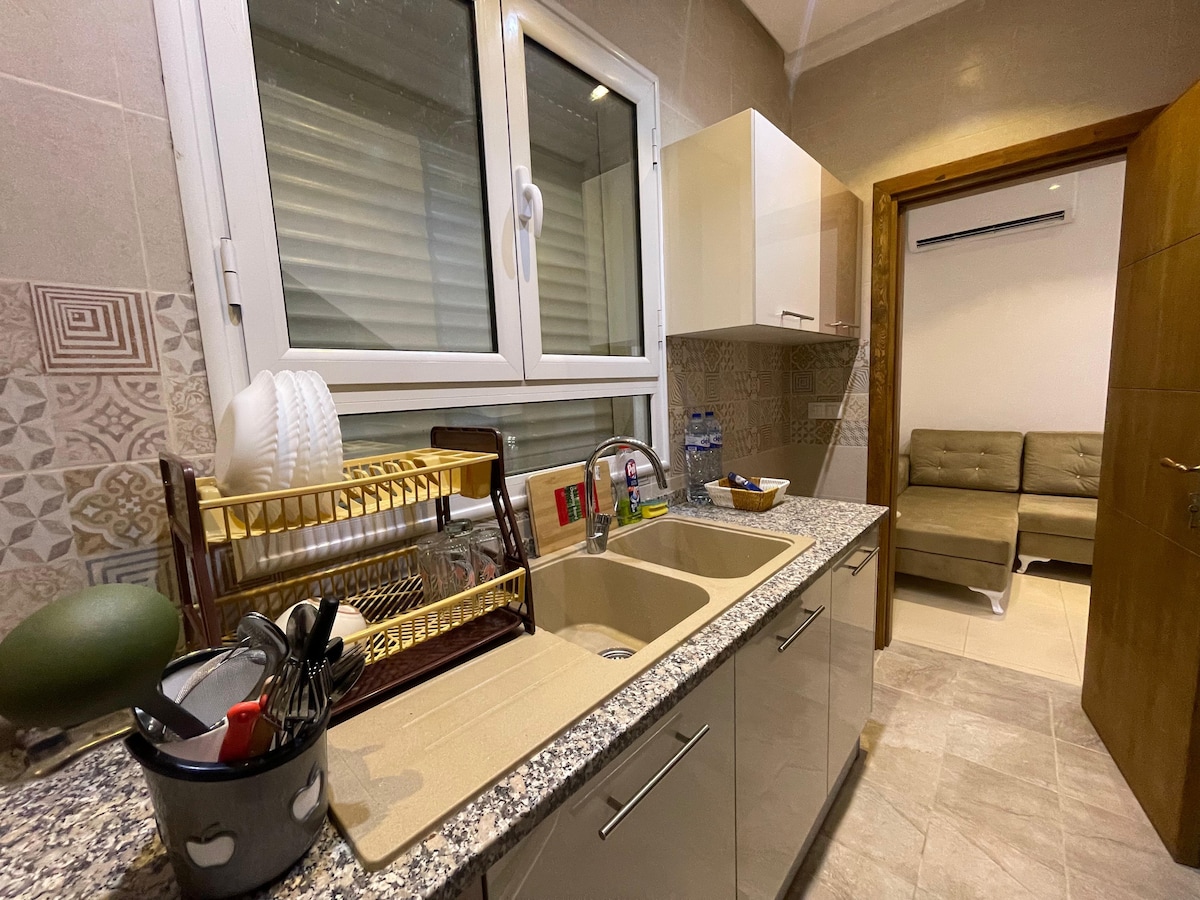 Disfrute de la comodidad que busca en una zona residencial muy elegante de Sousse, viva en un entorno acogedor, tranquilo, relajante, sin estrés y seguro... El Estudio consta de un dormitorio, una sala de estar con Smart TV conectada, IPTV, Wifi rápido, aire acondicionado y calefacción en las diferentes habitaciones, cocina americana equipada, una ducha a ras de suelo. Cerca de todas las comodidades. ¡No hay cortes de agua gracias a la lona de agua en la residencia!