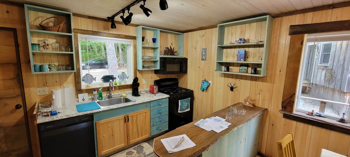 Escapada aislada en el bosque lo suficientemente cerca como para ver y escuchar el océano y ver increíbles puestas de sol. Encantadora cabaña 1BR + Loft, 1BA situada entre un acre de abetos Ocean Point que proporcionan privacidad y una escapada tranquila. A menos de 100 metros a pie de la orilla, la playa y el camino en Grimes Cove, Ocean Point Inn Restaurant & Bar y actividades diarias en el edificio del "casino" comunitario con parque infantil, tenis, pickle ball, baloncesto y softbol dominical. El puerto está a 20 minutos para explorar.