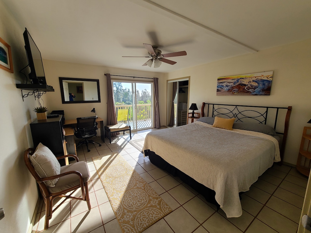 You'll walk up a short, forested path to a private keyless entrance with a front lanai sitting area in view of the native forest. Inside, a breakfast nook with toaster oven, toaster,coffee maker, kettle, and a small refrigerator. A cozy bedroom with a desk and a Smart tv await you. WiFi and cable are provided. Your private bath has a walk-in shower. The forest fronting my home is yours to explore. My home is within Volcano Village and just 2 miles from Hawai`i Volcanoes National Park.