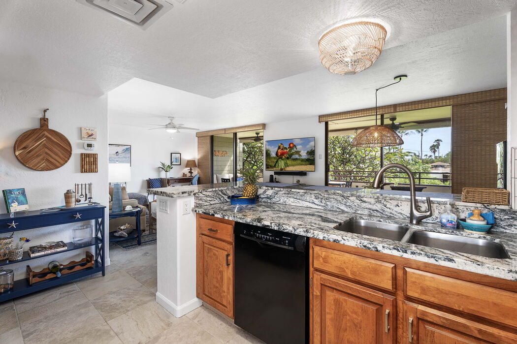 Elegante departamento en el último piso en White Sands Village, justo enfrente de Magic Sands Beach. Totalmente actualizado con nuevo aire acondicionado, ventiladores de techo en todas las habitaciones, pisos de baldosas, electrodomésticos modernos y baños de granito. Relájate en tu lanai privado con vista parcial al mar y disfruta de las comodidades del centro vacacional, que incluyen una piscina climatizada, jacuzzi, parrillas, canchas de tenis/pickleball, sauna y casa club. Se proporciona equipo de playa: sillas, snorkels, tablas de body y heladera. Cerca de la playa de Kahaluʻu, excelente para practicar esnórquel y del centro de Kona.