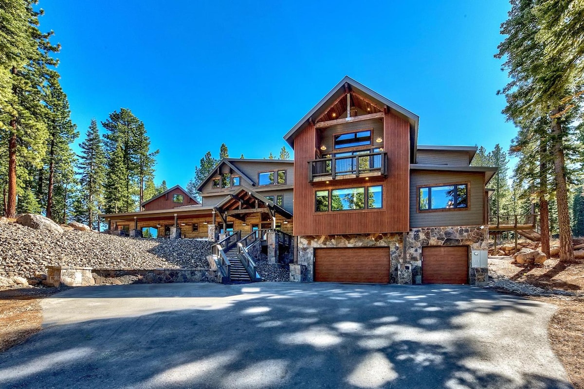 Perfect Polaris is a marvelous alpine villa in North Lake Tahoe, just minutes from Tahoe City and Skylandia Beach, and about a fifteen-minute drive from Homewood and Squaw Valley. The villa features ample outdoor living areas including an open-air hot tub, while its beautiful interiors are well-equipped for dining, relaxation, and play. Five comfortable bedrooms, including kid-friendly accommodations, form an ideal haven for families. Built of fine timber and nestled amid serene pine forests, this classic Tahoe home immerses you in the rich natural beauty of California's Sierra Nevada. Wrap-around decks extend from both floors of the house, connected by a spiral staircase. Cook barbeque meals on the upper deck and relish them alfresco at the table for six. Soothe your body in the hot tub on the lower deck after an exciting day on the slopes or trails. The outdoor dining area extends from the interior great room, forming an expansive space for evening festivities in every season. Light a fire in the impressive hearth and sip warm beverages in the lounge. Prepare meals in the fully equipped kitchen, serving apps and cocktails at the bar, and gather around the dining table for a well-earned feast. Gather in the cavernous game room before bed, cozying up with your favorite movies or shooting some games of pool. Perfect Polaris gives you exquisite privacy within minutes of Tahoe's famed dining, beaches, and ski slopes. Myriad destinations are within five to fifteen minutes of your door, including Tahoe City, Crystal Bay, multiple ski resorts, and several outstanding beaches, including Commons, Skylandia, and Speedboat. Golfers can take their pick of several renowned courses, including Old Brockway, Northstar, and the Championship Golf Course. Copyright © Luxury Retreats. All rights reserved. BEDROOM & BATHROOM • Bedroom 1 - Primary: King size bed, Ensuite bathroom with heated floors and stand-alone rain & steam shower, Dual Vanity, Walk-in closet, Fireplace, Television, Access to shared terrace • Bedroom 2: King size bed, Ensuite bathroom with stand-alone shower, Dual Vanity, Walk-in closet, Television, Access to shared terrace • Bedroom 3: King size bed, Ensuite bathroom with stand-alone shower, Dual Vanity, Television, Access to shared terrace • Bedroom 4: Bunk bed (twin over full), Ensuite bathroom with hall access, Shower/jetted tub combo • Bedroom 5 : 2 Twin beds, Shared access to hall bathroom with bedroom 4 Additional Bedding • Game Room: Sofa bed