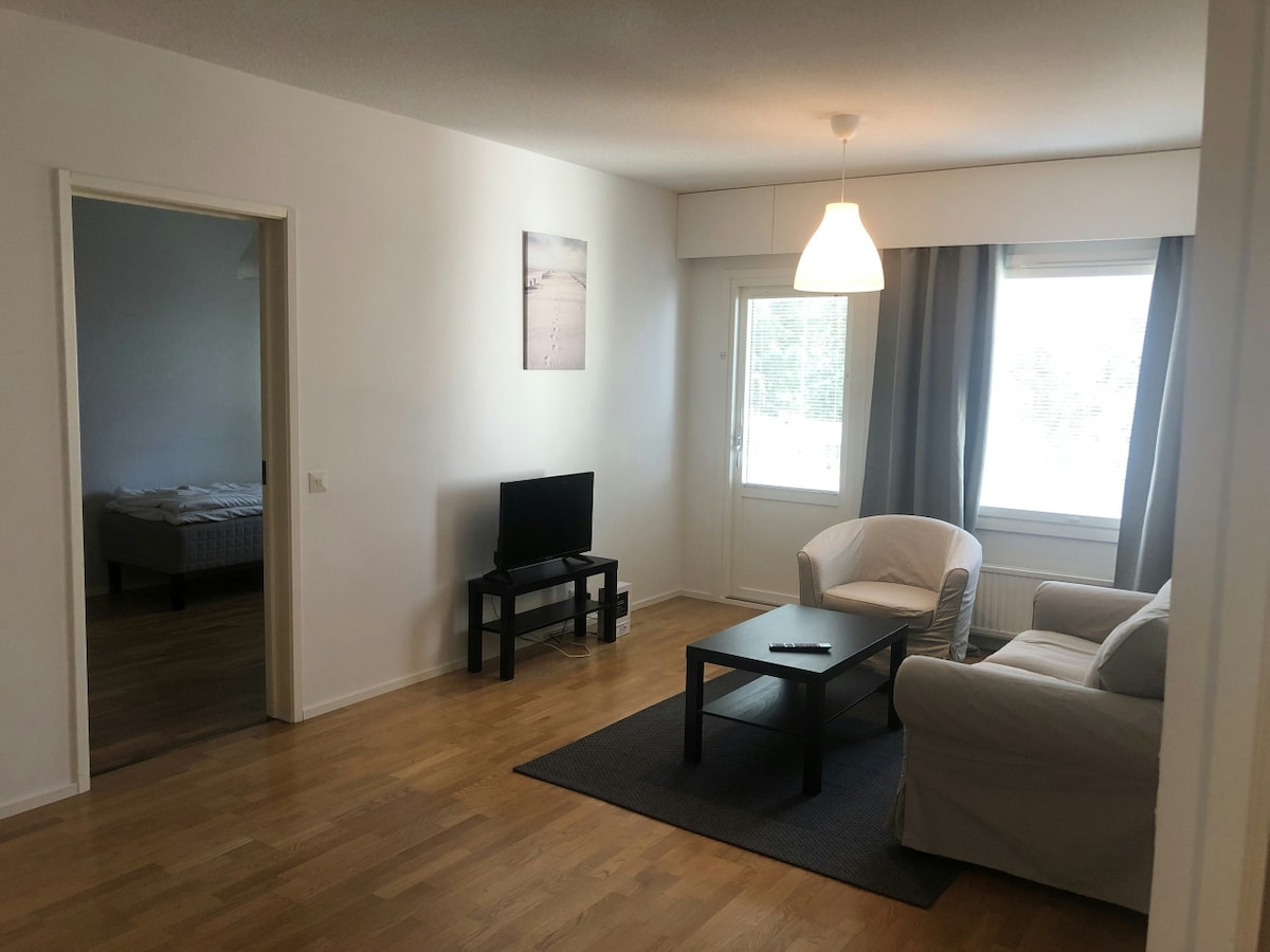 Well-maintained 3-room apartment with a private sauna, located about 2 km from Seinäjoki city center. Fully furnished and equipped with essential cooking tools—just bring your personal items. Bed linens, towels, and a private parking space are included.